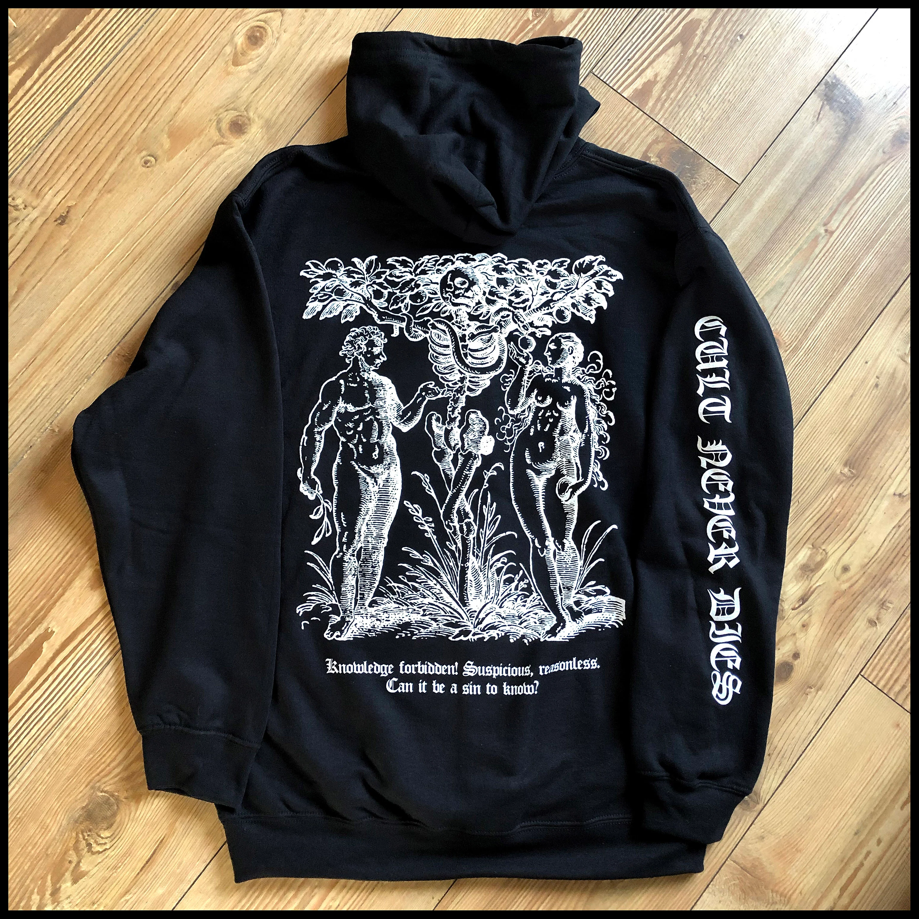 Our first official CULT NEVER DIES hoodie (not *the* first curiously, as a bootleg one was being sold for a time by persons unknown) available in time for winter. Includes front, back and sleeve prints.